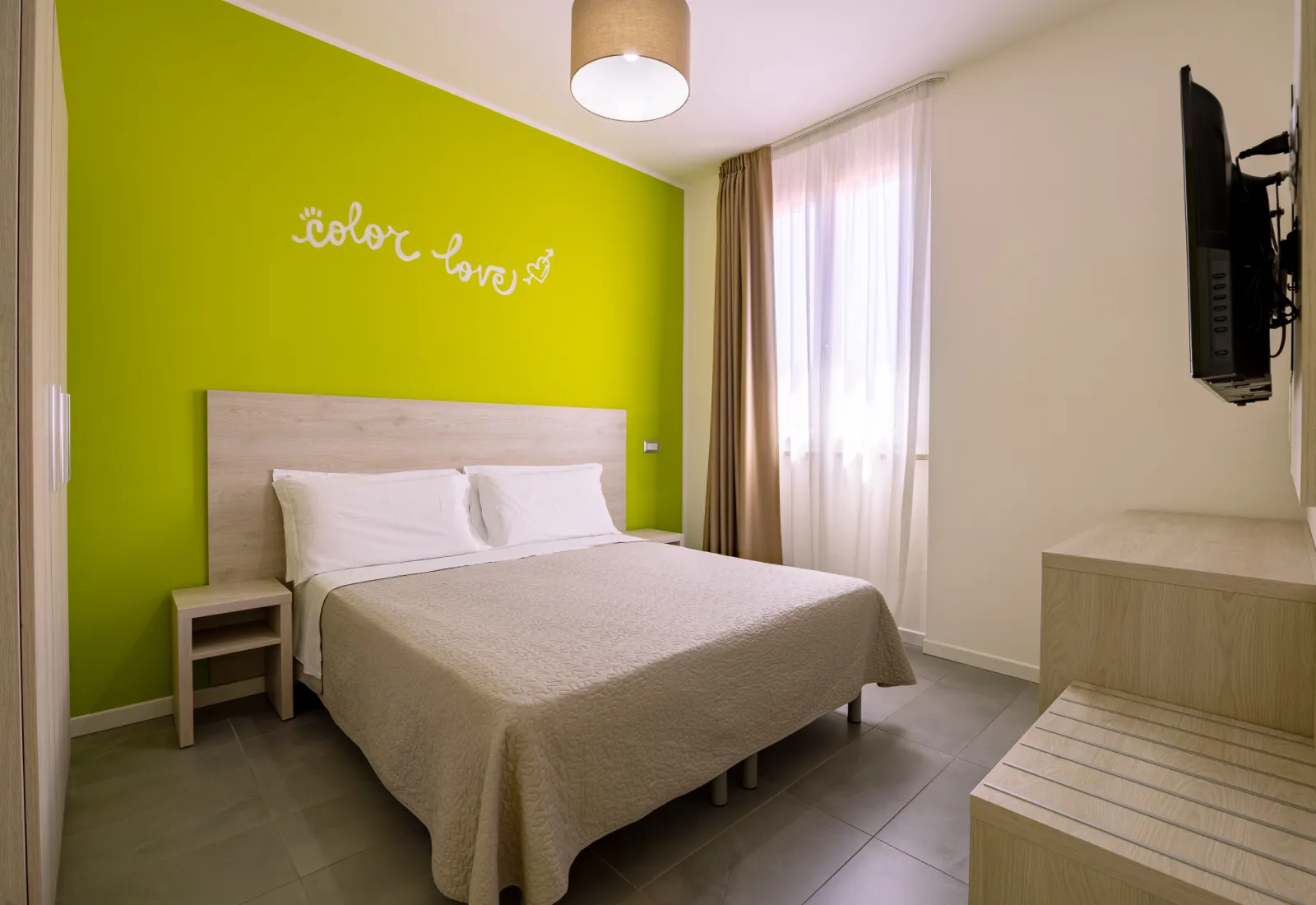 Die modernen, in hellen Farben gehaltenen Zimmer sind mit jeglichem Komfort ausgestattet und auf Wunsch könne sie auch die Version mit Balkon buchen. Sie sind ideal für 4-köpfige Familien und verfügen über ein Doppelbett und ein Etagenbett.