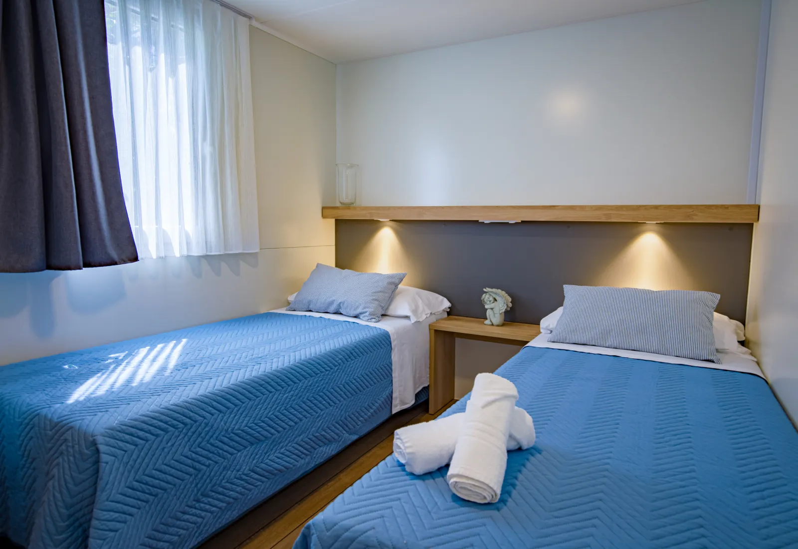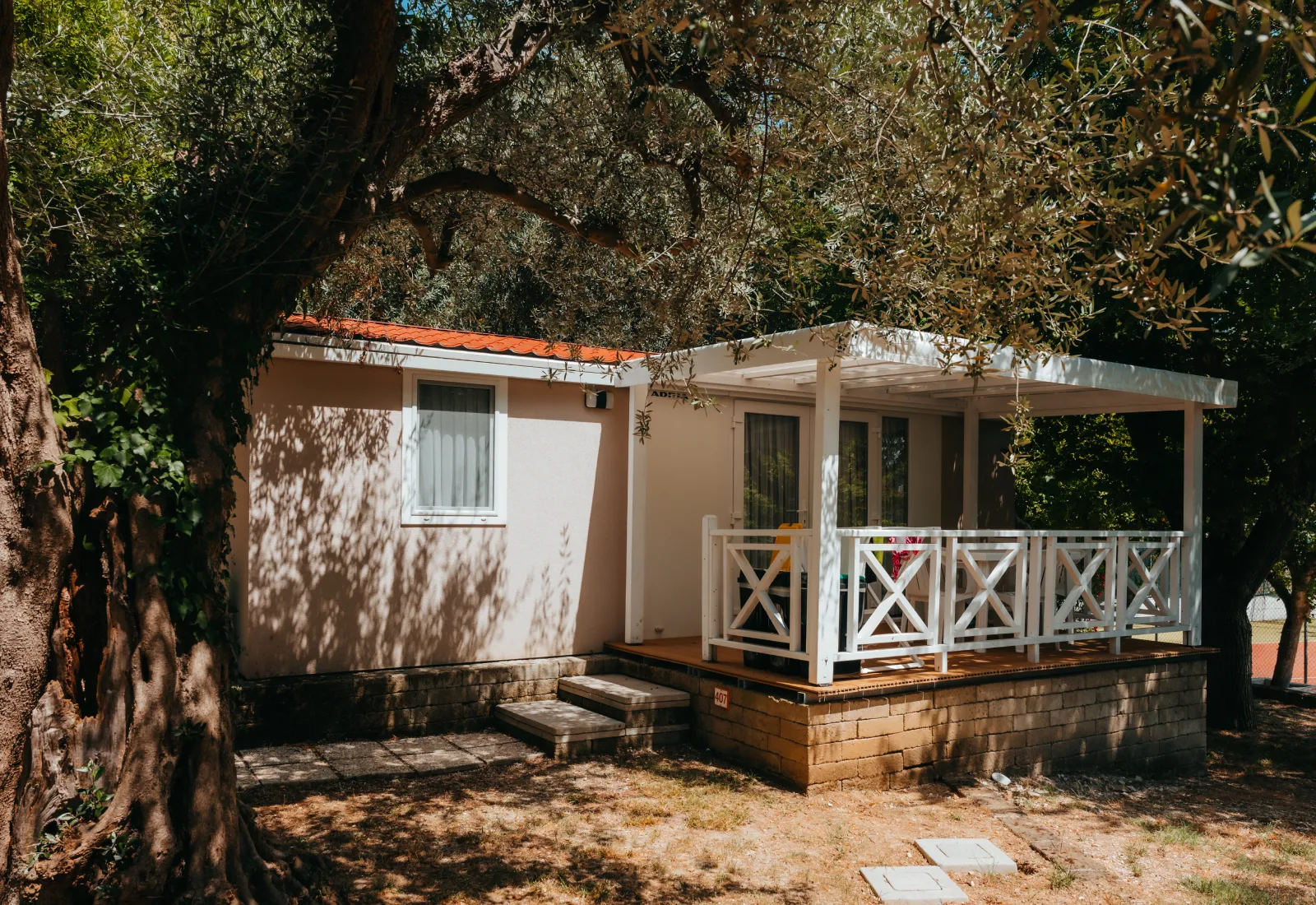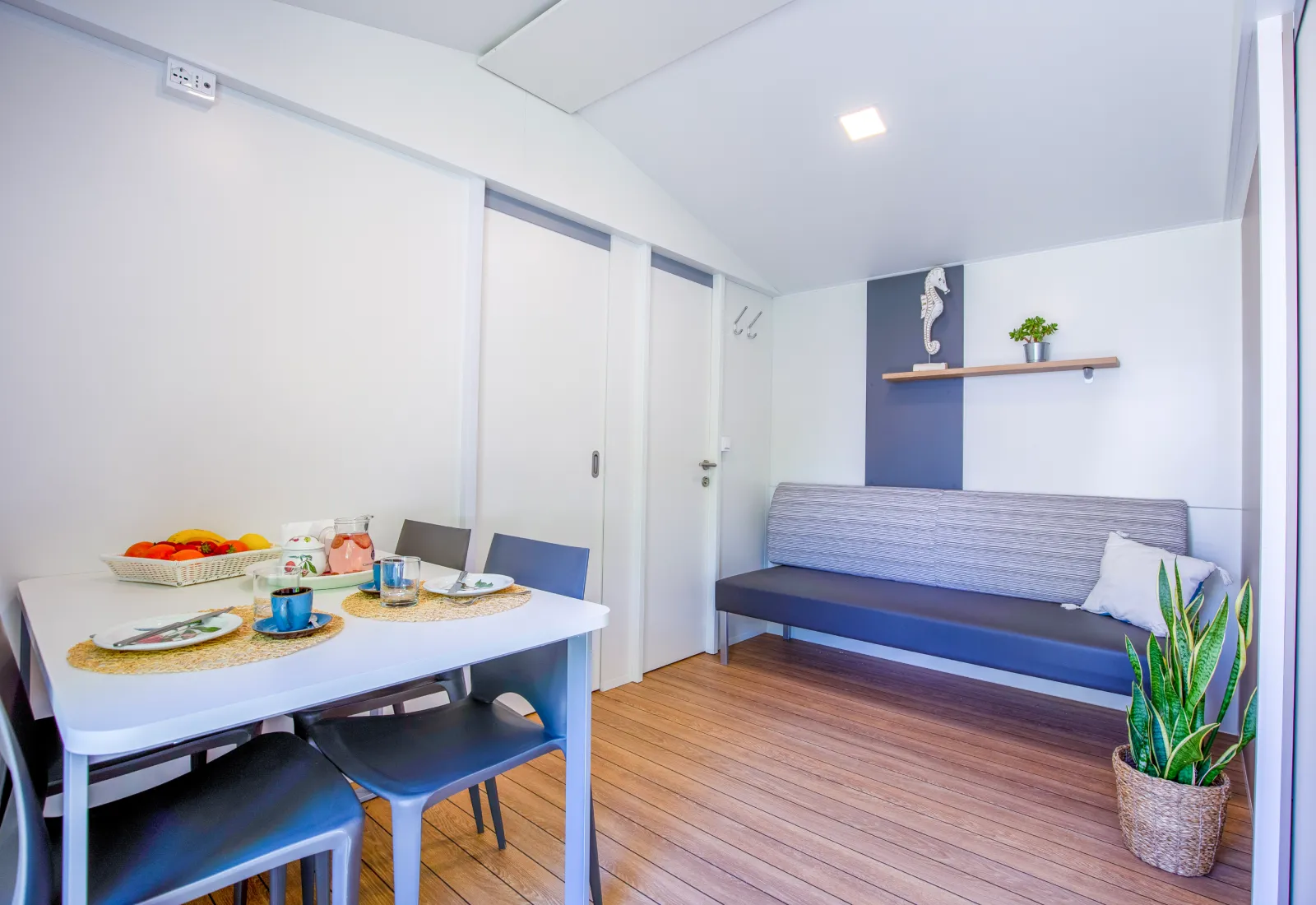 Trilocali che uniscono eleganza e praticità: camera matrimoniale, cameretta con due letti singoli, zona giorno con cucina e frigorifero, bagno con doccia e bidet. All’esterno veranda coperta con tavolo e sedie. Dotazioni: aria condizionata, TV, biancheria con cambio settimanale, stoviglie e utensili.