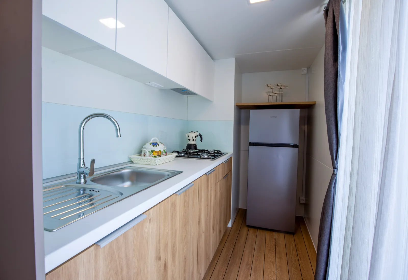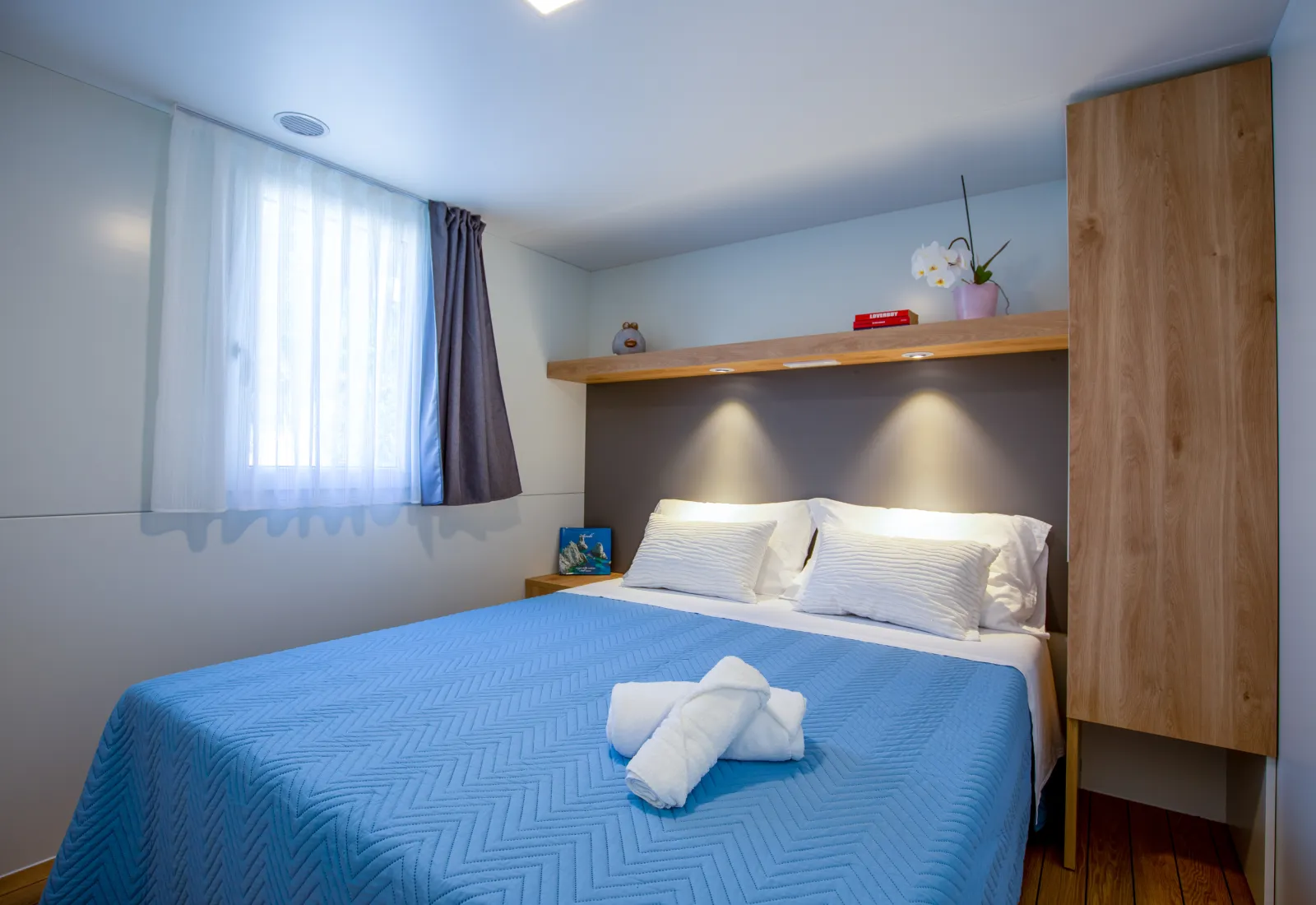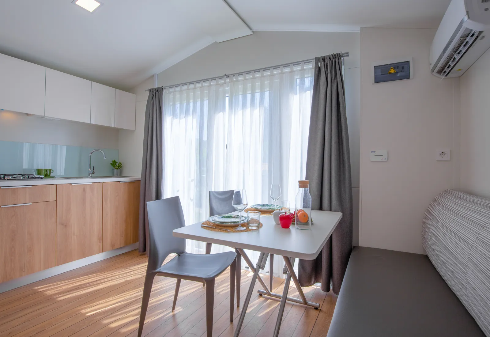 Trilocali che uniscono eleganza e praticità: camera matrimoniale, cameretta con due letti singoli, zona giorno con cucina e frigorifero, bagno con doccia e bidet. All’esterno veranda coperta con tavolo e sedie. Dotazioni: aria condizionata, TV, biancheria con cambio settimanale, stoviglie e utensili.